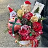 1个草编篮;1个苹果(透明膜包裹蝴蝶结装饰);2个玩偶;3支落雪红玫瑰;1支棉花;2片柠檬(可用黄金球代替)搭配柏树叶等配花按图制作